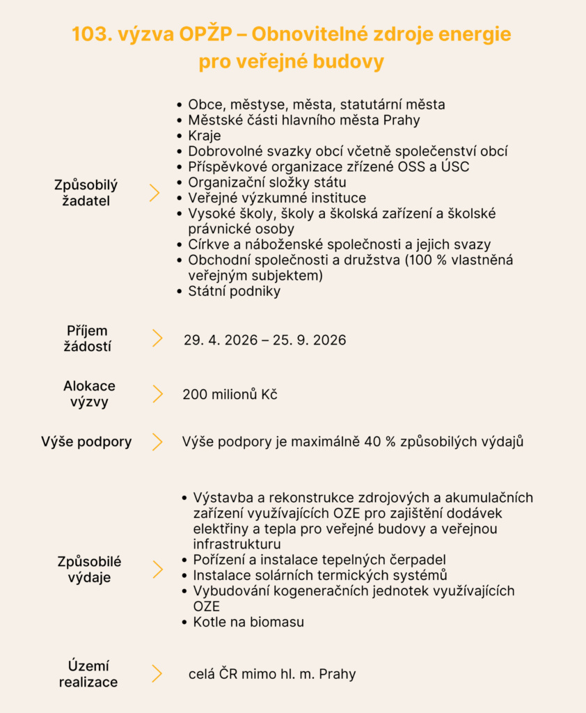 Žadatelé mohou získat dotace až 40 % na pořízení tepelných čerpadel, solárních termických systémů, kotlů na biomasu a kogeneračních jednotek pro veřejné budovy. Výzva na obnovitelné zdroje energie pro veřejné budovy je kombinovatelná s výzvou č. 102 pro komplexní energetické projekty. Alokace činí 200 mil. Kč, příjem žádostí probíhá od dubna do září 2026.